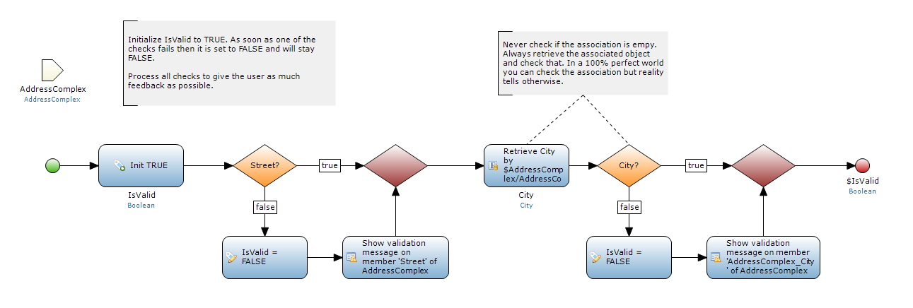 Save microflows with validation as shown above is what I use consistently. The same approach can be used where you have to check a set of data, for example when importing Excel files or processing post webservices. Then you don’t show messages to a user, but you collect the validation messages in a dedicated mechanism to inform the user or webservice about the process.