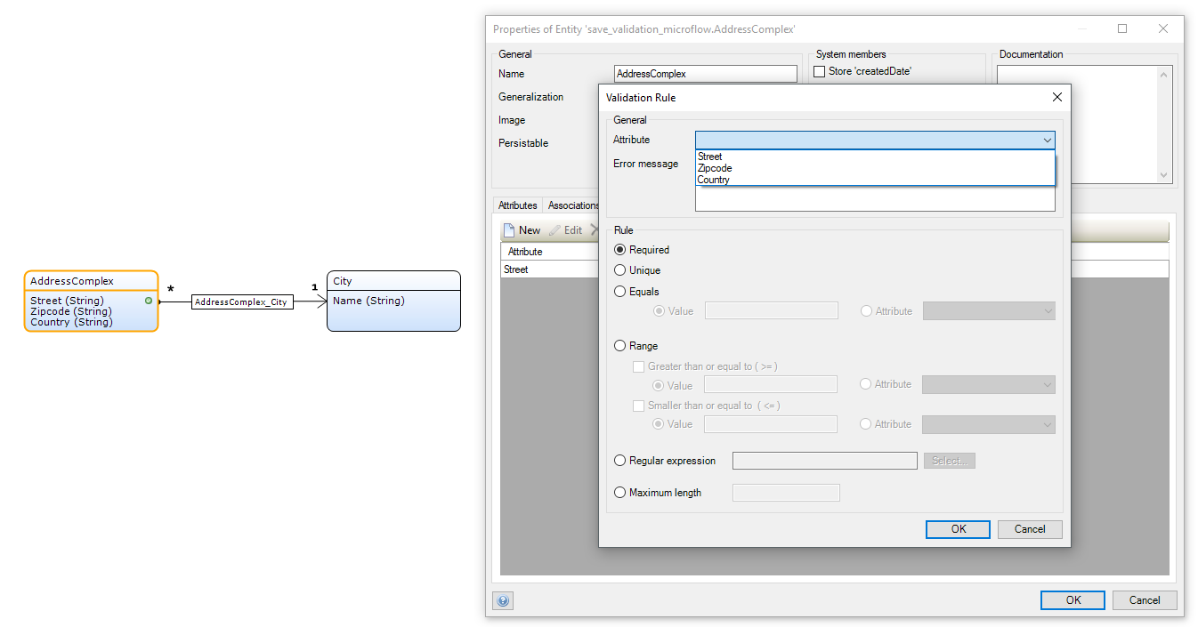 The screenshot below shows the issue. This time entity Address does not have a City attribute anymore; it is an association to a reference table with all available cities. An address has become a logical entity in your model because it consists of entity Address including the association to entity City. You cannot define a validation rule on the existence of a city in your address.