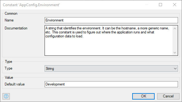 First you define a single constant called Environment where you modify the value per environment to your need. Set the default value to a non-production environment or to a dummy value, see the example below, to prevent out of the box deployments to behave like production.