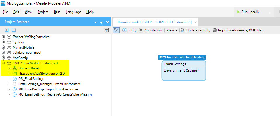 Additionally, but that is too much for this blog post, you have to make sure that the processes of the original module are using the new environment attribute. Add changes to the new module, and do not change the AppStore module except for excluding superseded pages, microflows and scheduled events to prevent them from being used. For the SMTPEmailModule example the next changes should be made: